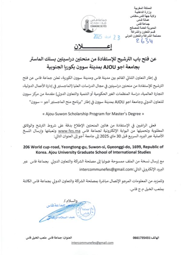 في إطار التعاون الثنائي القائم بين مدينة فاس ومدينة سوون الكورية، تعلن جماعة فاس عن فتح الترشيح للإستفادة من منحتين دراسيتين في مجال الدراسات العليا (الماجستير في إدارة الأعمال الدولية، التجارة العالمية، دراسة المنظمات الغير الحكومية أو التنمية والتعاون الدولي) مقدمة من مركز سوون للتعاون الدولي وجامعة اجو AJOU بمدينة سوون في إطار “برنامج منح الماجستير آجو – سوون”