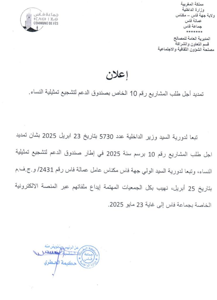 تمديد أجل طلب المشاريع رقم 10 الخاص بصندوق الدعم لتشجيع تمثيلية النساء