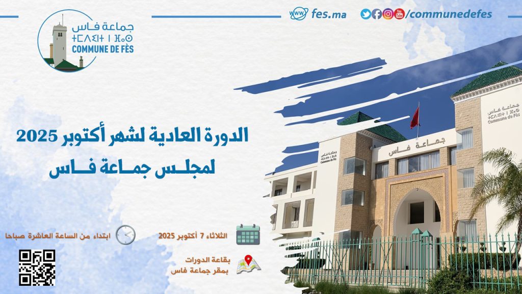 طبقا لمقتضيات القانون التنظيمي رقم 113.14 المتعلق بالجماعات، وخاصة المادة 35 منه، سيعقد مجلس جماعة فاس دورته العادية لشهر أكتوبر يوم الثلاثاء 07 أكتوبر 2025 على الساعة العاشرة (10:00) صباحا بقاعة الدورات بمقر الجماعة